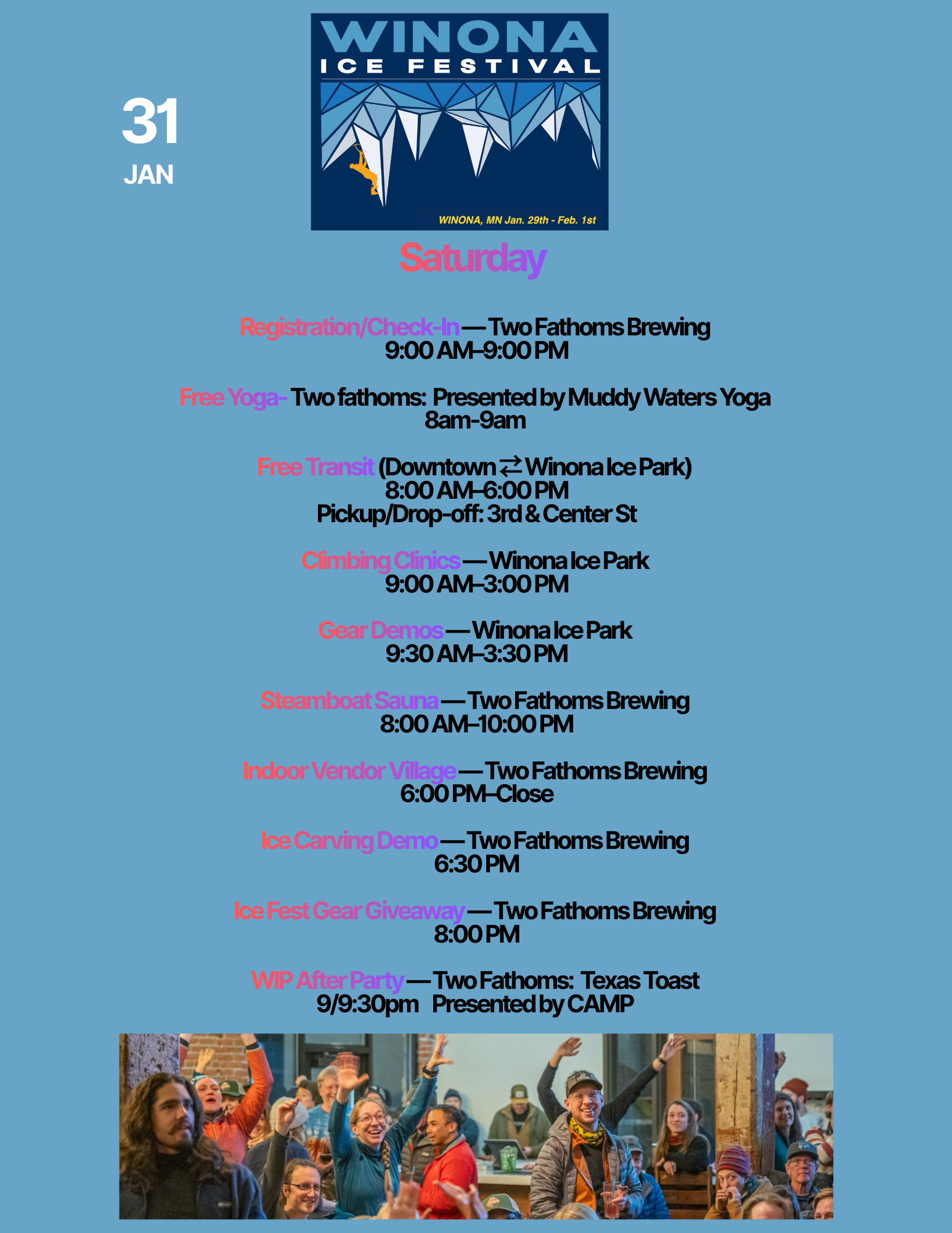We are so excited to host our 3rd annual ice festival and can’t wait to celebrate the Winona Ice Park and ice climbing with a bunch of friends new and old! We are thankful to everyone who supported our first two years and look forward to seeing more smiling faces this coming year!